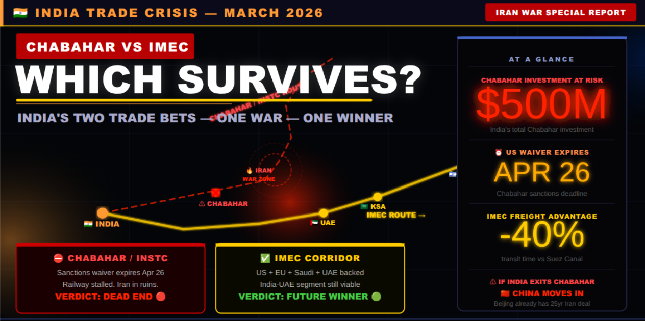 The honest answer is: neither route is fully operational right now. But only IMEC has a credible path back to full operation. Chabahar’s future depends entirely on what kind of Iran emerges from this war — and that is a question no one can answer yet.